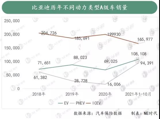 今年前十个月,比亚迪52万新车销量中,EVPHEVICEV分别占比38.25%29.14%32.61%,这应该是目前体量最大,电动化程度最高的车企。 从历年数据来看,比亚迪除了电动化程度越来越高,APHEV车型今年的增长速度也非常惊人,相较于去年全年,增长近5倍。相比之下,同级别的燃油车却出现了下滑。