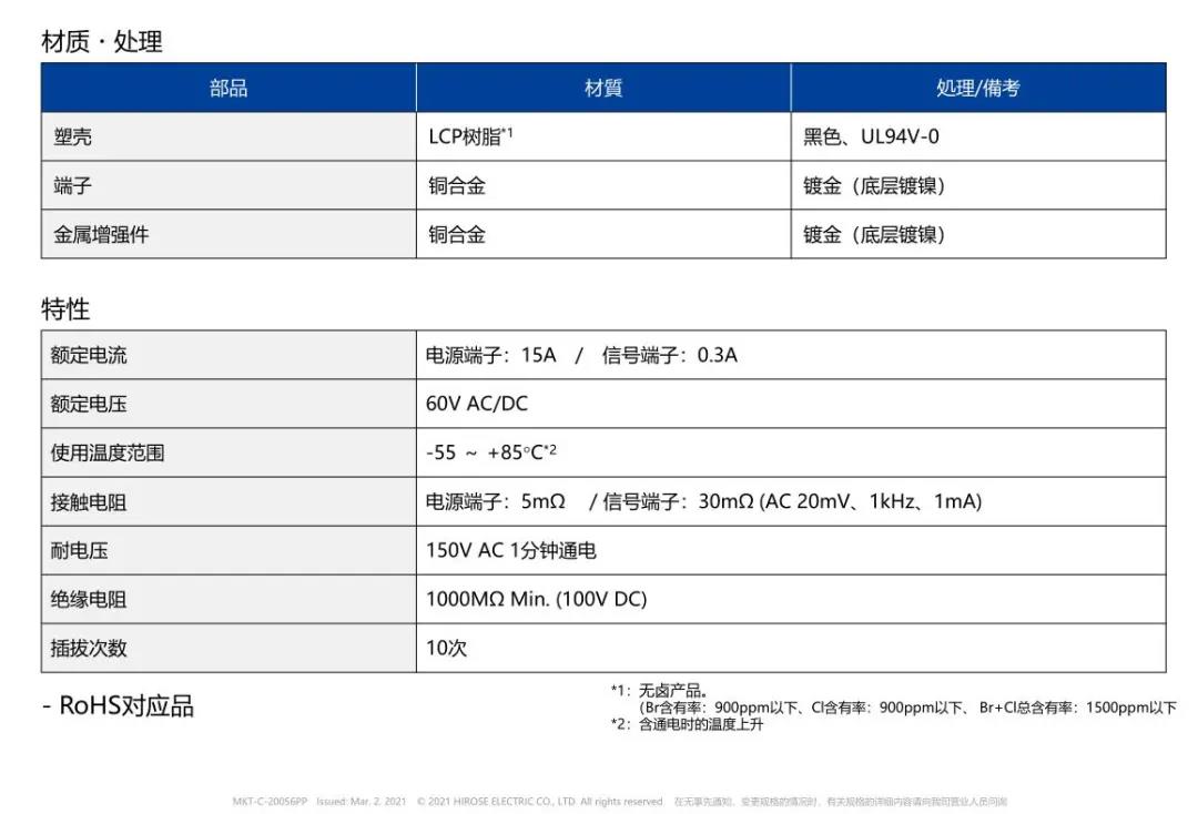 特点 1 兼顾供电能力和小型化的设计 - 额定电流:支持电源端子15A、信号端子0.3A - 嵌合高度:0.6mm、纵深:2.0mm 2 通过全包覆构造,确保高牢固性 3 使接触电阻最小化,节省电力 4 实现小型,高抜出力 5 互相夹紧型多触点构造,确保高接触可靠性 有助于小型化&大电流化