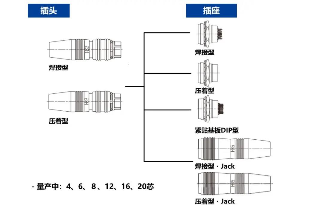 特点 1 超小级高密度圆形连接器 2 具有良好操作性的推拉锁 3 EMI对策设计 4 支持Cat.5e(1Gbps)高速以太网※ 5 丰富的选型 ※传输性能可根据线缆・引脚尺寸・结线方法而改变, 线束后确认实力。
