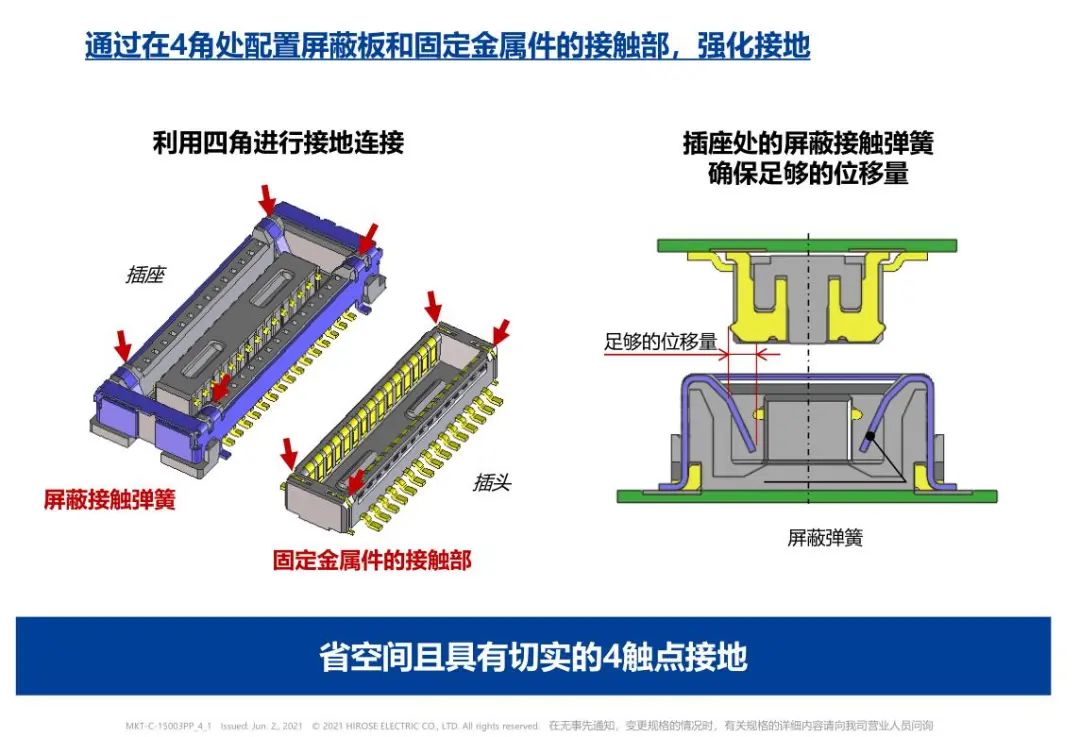 切实的接地构造 通过接地实现优越的EMI对策 进一步强化接地 检查用连接器