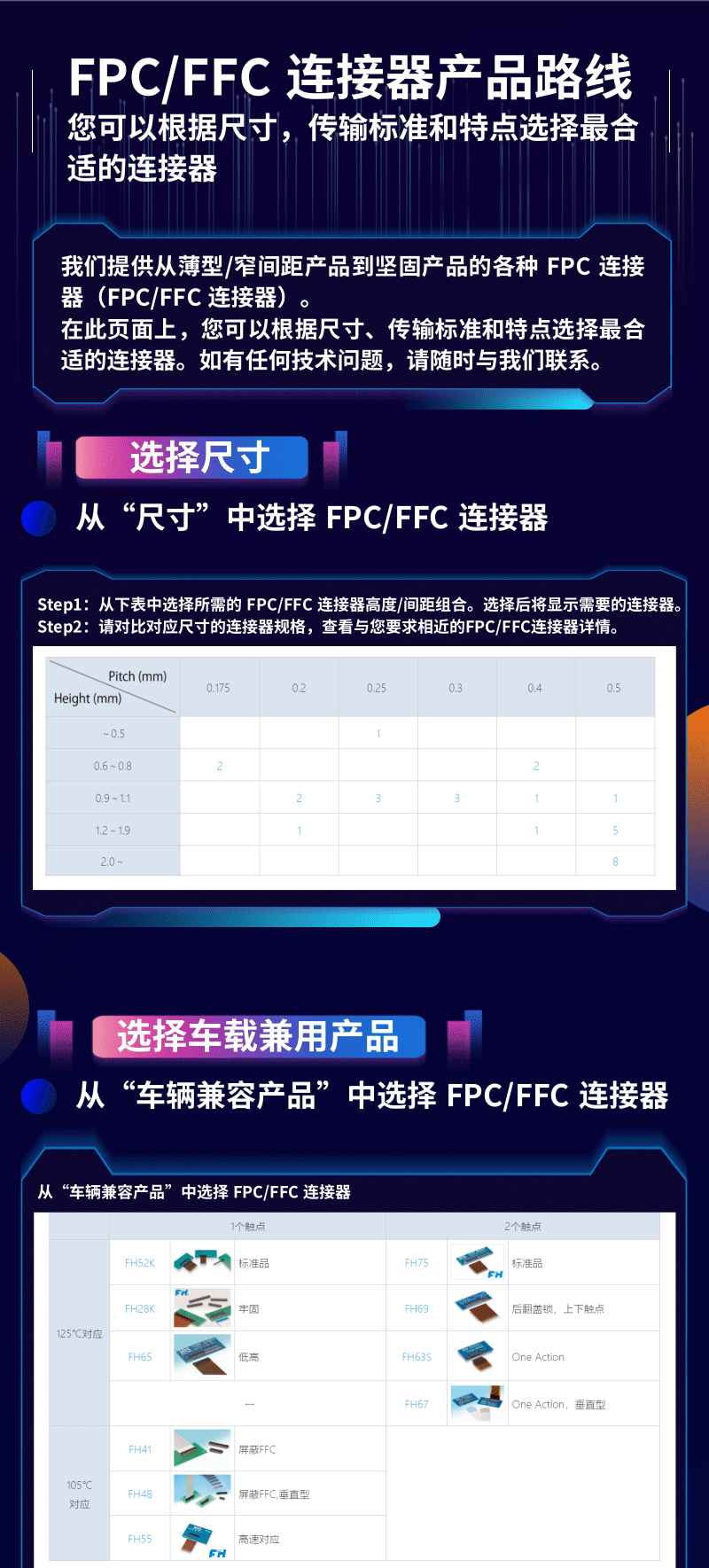 我们提供从薄型/窄间距产品到坚固产品的各种 FPC 连接器(FPC/FFC连接器)。